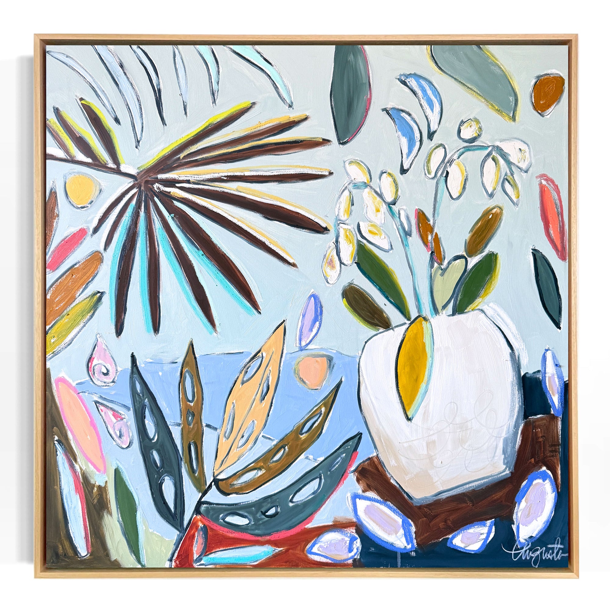 This original painting is a 48” height x 48” width x 1.5” depth mixed oil media (oil paint and pastel) on stretched canvas. It is framed in a white oak floater frame which adds an extra inch all around.