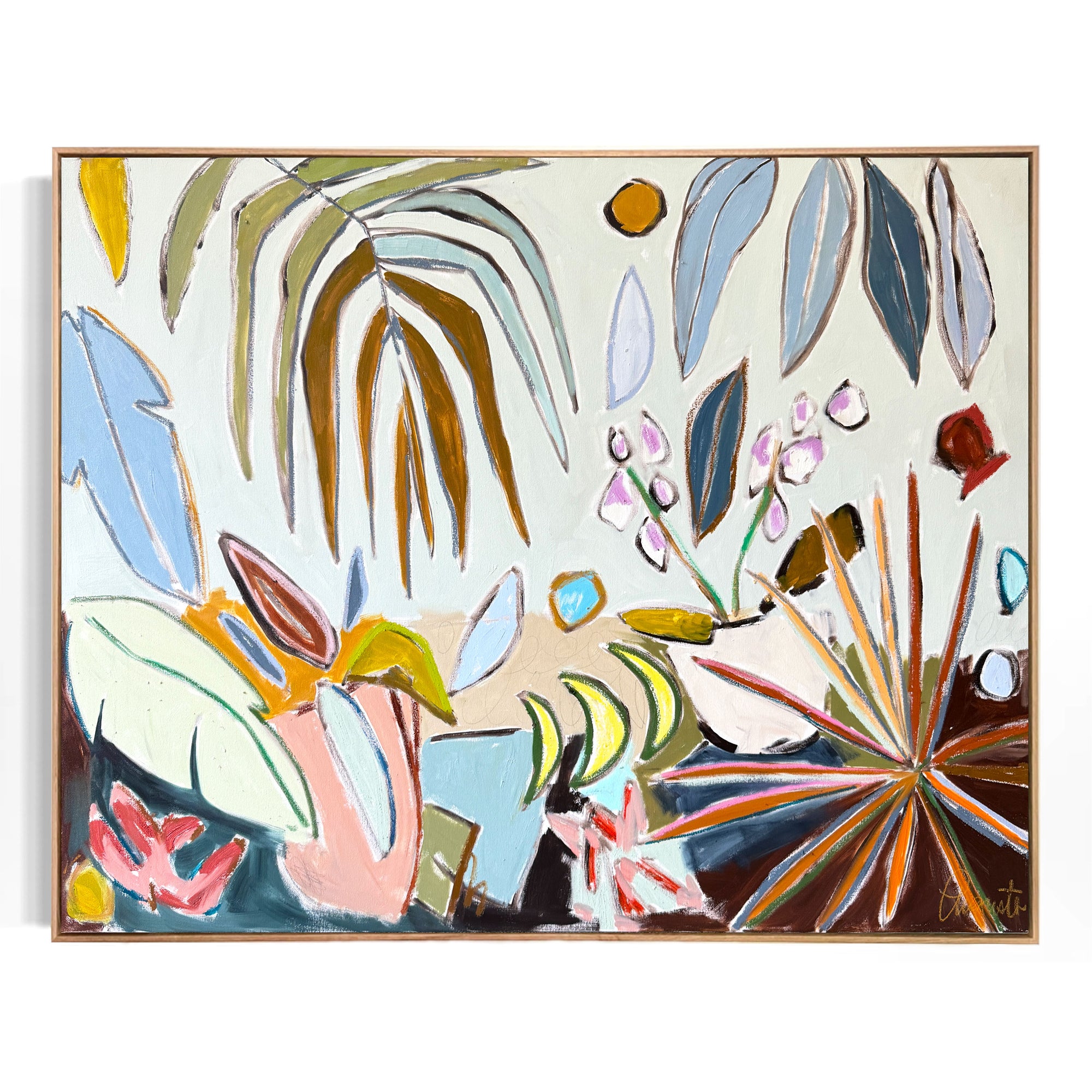 This original painting is a 48” height x 60” width x 1.5” depth mixed oil media (oil paint and pastel) on stretched canvas. It is framed in a white oak floater frame which adds an extra inch all around.